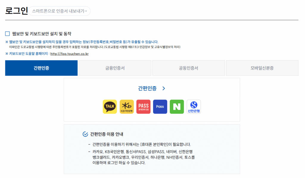 - 간편인증: 카카오, 네이버, PASS, 신한은행 등 가능