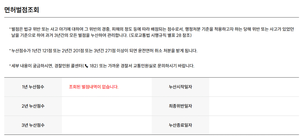 - “조회된 벌점 내역이 없습니다.” 라는 메시지가 뜨면 현재 벌점이 0점인 상태입니다.