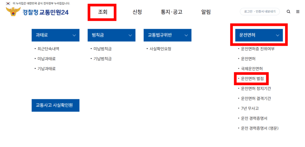 - 상단 메뉴에서 [조회] > [운전면허] > [운전면허 벌점] 선택