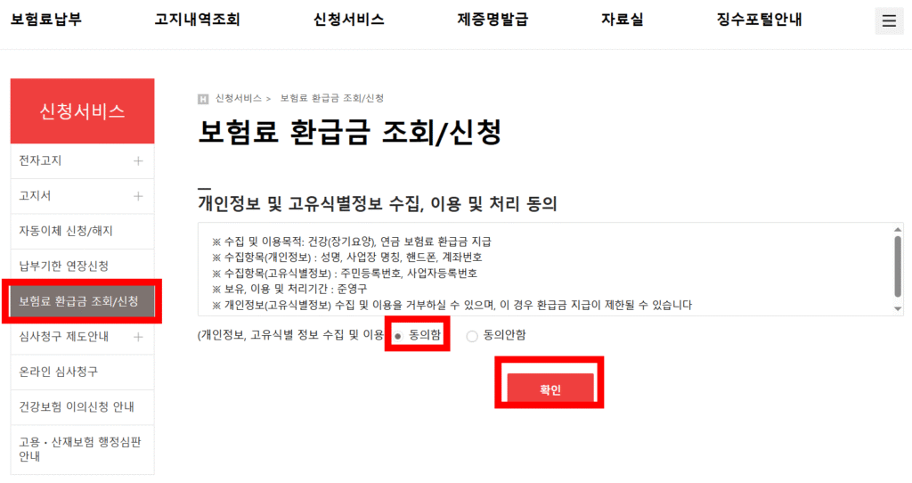 - 메뉴: 민원신청 > 보험료 환급금 조회/신청