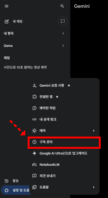 제미나이 왼쪽 사이드바에서 [설정 및 도움말] → [구독 관리]로 들어갑니다.