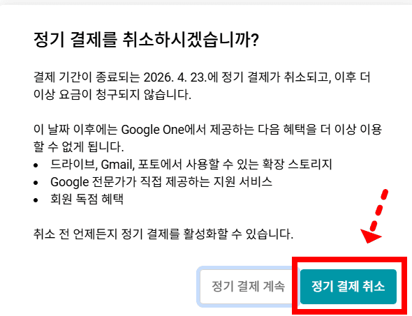 취소 안내를 확인한 뒤, [정기 결제 취소] 버튼을 다시 한 번 눌러주세요.