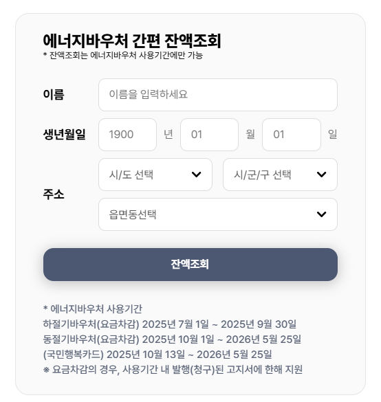 에너지바우처 잔액조회 바로가기 ❯❯💡 참고: 카드 수령 직후에는 잔액이 보이지 않을 수 있으며, 지자체의 최종 지원 확정 후 반영됩니다.
