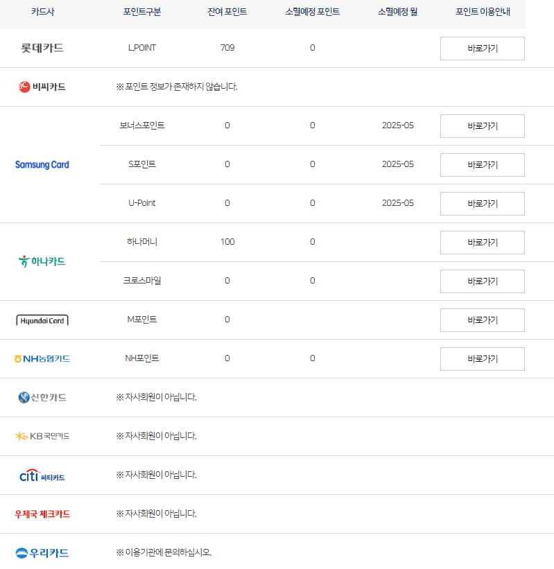 - 인증이 끝나면 내가 보유한 모든 카드사의 포인트 내역이 나옵니다.