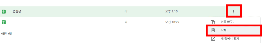 삭제된 스프레드시트 파일을 찾은 후, 해당 항목의 세 점 아이콘(⁝) 클릭