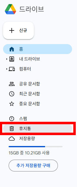 삭제된 문서는 곧바로 사라지지 않고, ‘드라이브 > 휴지통’으로 이동합니다.